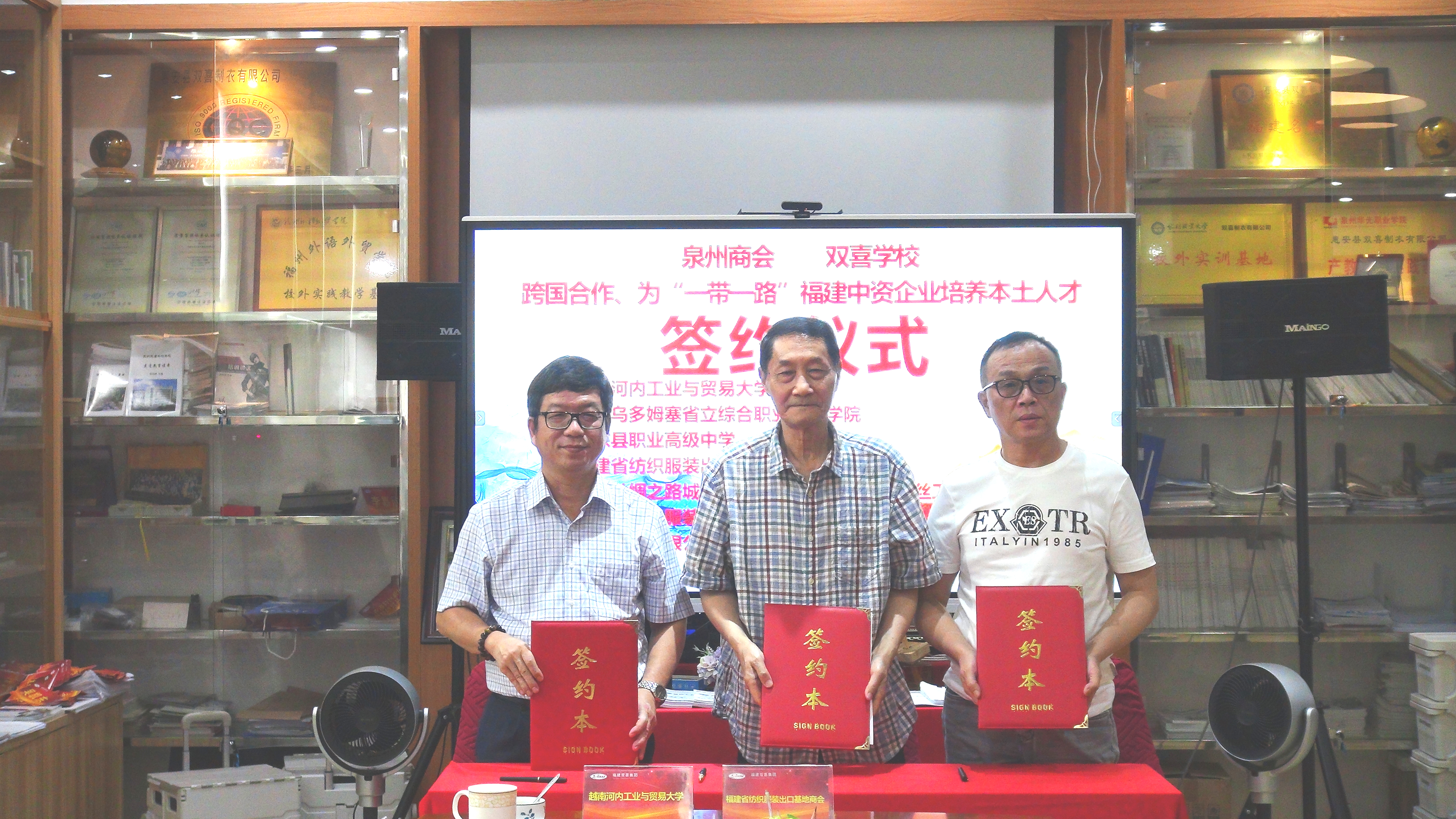 此次訪問的重要成果之一,是于8月6日成功舉辦了多方合作簽約儀式。越南河內(nèi)工業(yè)與貿(mào)易大學(xué)、老撾烏多姆塞省立綜合職業(yè)技術(shù)學(xué)院及云南景東高級職業(yè)中學(xué),與福建省紡織服裝出口基地商會(huì)、海陸絲綢之路城市聯(lián)盟工商理事會(huì)、泉州海絲工商聯(lián)合會(huì)、泉州紡織服裝商會(huì)、雙喜制衣有限公司、泉州雙喜科技學(xué)校等機(jī)構(gòu),共同簽署了合辦“雙喜國際班”、聯(lián)合培養(yǎng)“一帶一路”國際化技術(shù)管理人才的合作協(xié)議與備忘錄。泉州臺商投資區(qū)教育文體旅游局中教科陳志文科長、泉州海絲工商聯(lián)合會(huì)陳蒼松秘書長等領(lǐng)導(dǎo)嘉賓出席了簽約儀式并見證了多方合作的開啟。